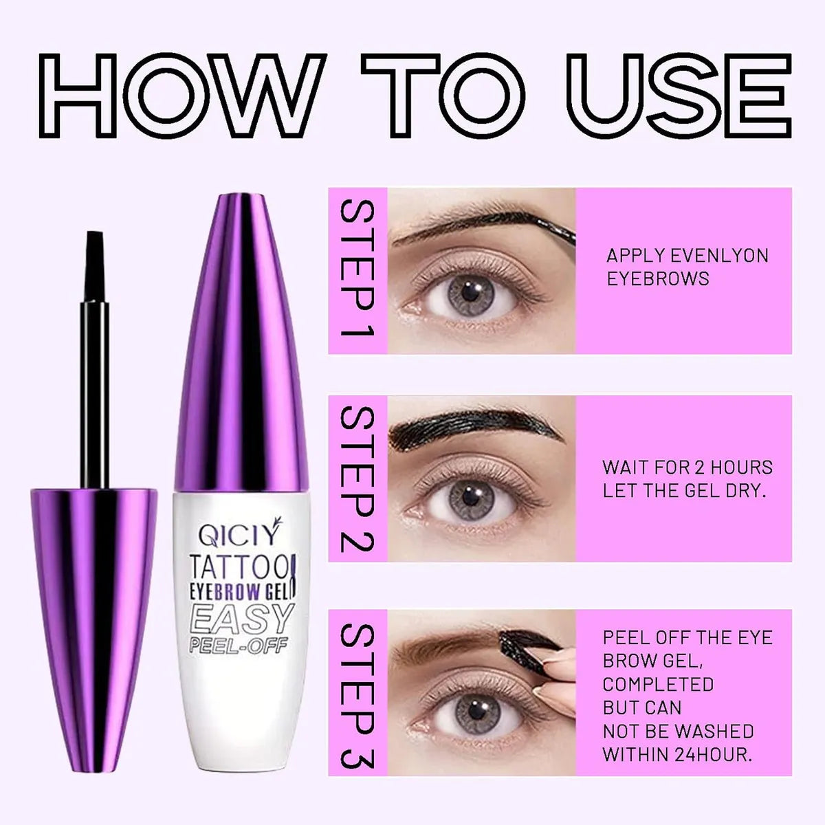 3.Peel off: Gently peel off the gel to reveal your defined brows. Do not get them wet for 24 hours.
